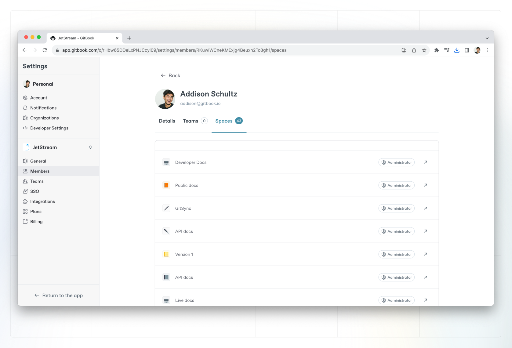 Select the **Teams** and **Spaces** tabs to see a list of the [teams](https://gitbook.com/docs/~/changes/pfQHJq75QY5xMYvctdXP/account-management/member-management/teams) they’re a member of, and the spaces they have access to — as well as their access level for those specific spaces.