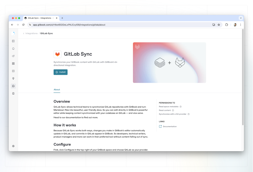 To install an integration ins a space or site, you can do so from the **integration** menu in the [sub-navigation](https://gitbook.com/docs/~/changes/pfQHJq75QY5xMYvctdXP/content-editor/editor/navigation#space-header-and-sub-navigation) within a space, or the header in a [docs-site](https://gitbook.com/docs/~/changes/pfQHJq75QY5xMYvctdXP/published-documentation/publish-your-content-as-a-docs-site).