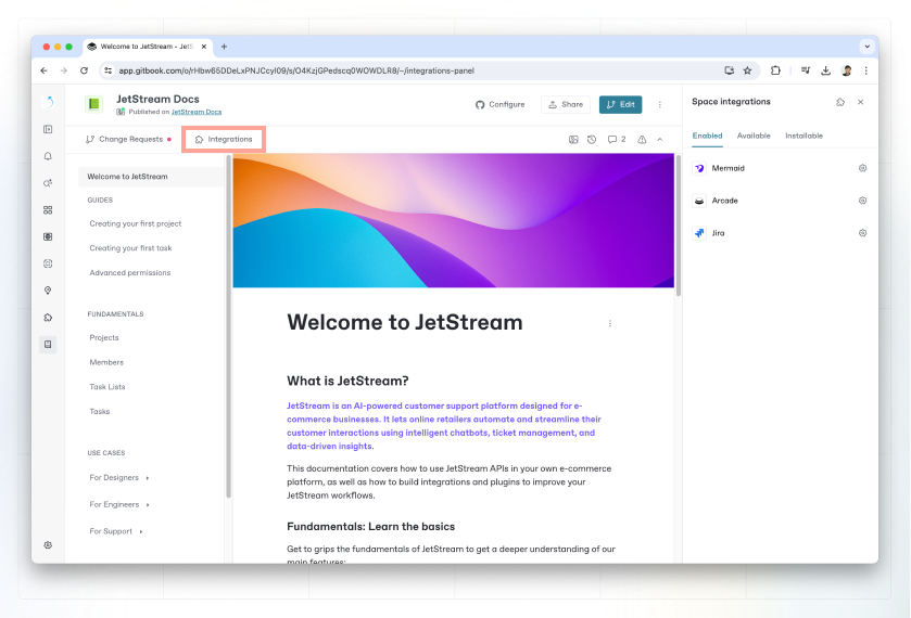 Before enabling an integration into a space or site, you'll need to install it in your organization. Start by clicking **Integrations** in the sidebar on the left.