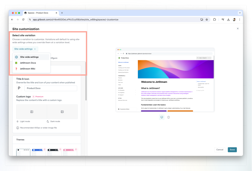 If you have [a docs site with more than one linked space](https://gitbook.com/docs/~/changes/pfQHJq75QY5xMYvctdXP/published-documentation/publish-multiple-spaces-on-one-site), you can control the customization of each variation individually.