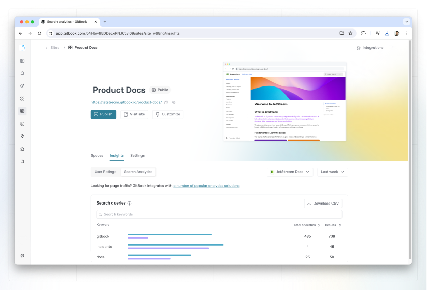 The information here can be helpful for informing your content architecture, making certain parts of your documentation easier to find without search, or adding additional content to existing pages based on what your visitors are searching for.