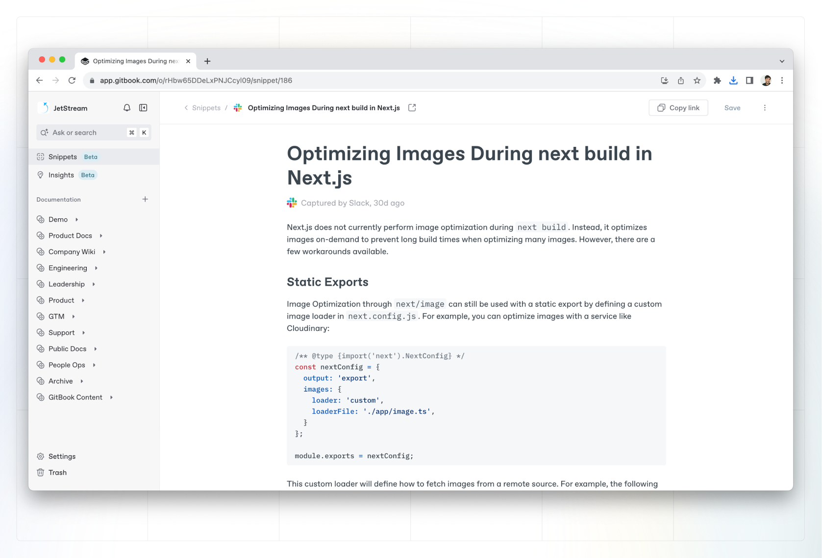 In GitBook, you can capture unstructured information using [integrations](https://gitbook.com/docs/~/changes/pfQHJq75QY5xMYvctdXP/integrations), and GitBook AI will turn it into a **snippet** — a structured page of information that’s easy to read and digest. You can also create snippets manually within the app.&#x20;